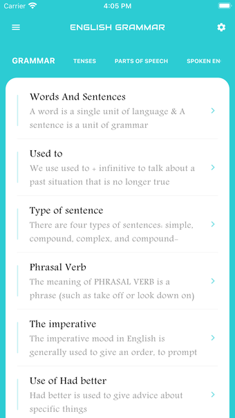 หนังสือเรียนภาษาอังกฤษเกี่ยวกับไวยกรณ์ได้รับการปรับแต่งให้เหมาะสมกับ iPhone เพื่อให้ผู้ใช้ได้สัมผัสประสบการณ์การใช้งานที่ราบรื่น แอปมีการใช้งานง่าย ใช้งานได้ง่าย และเข้าถึงได้ง่าย ทำให้ผู้เรียนทุกระดับสามารถเข้าถึงได้